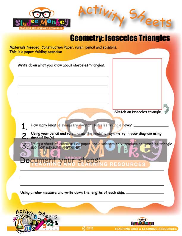 Three Activity Sheets that can add a punch to your lessons on Triangles. Students would need to get their tools: scissors, rulers, pencils etc. Both Educators and parents can make this a very attractive learning activity.