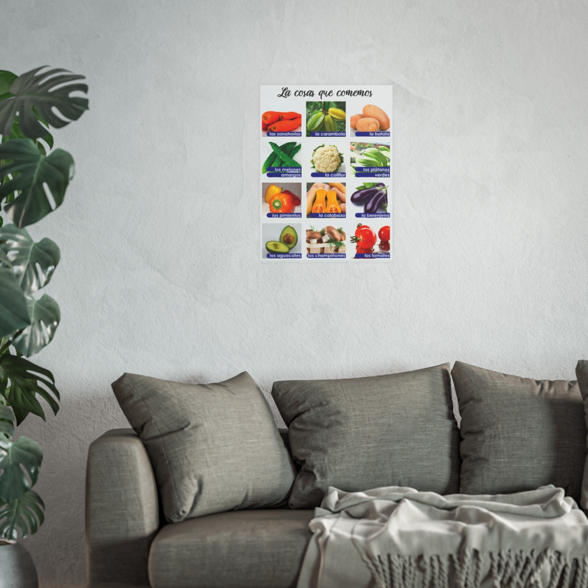 El cartel de La cosas que comemos es un póster colorido e informativo que muestra los diferentes tipos de plantas que comemos y cómo benefician a nuestro cuerpo. También presenta algunos ejemplos de frutas y verduras comunes y exóticas de todo el mundo, como plátanos, zanahorias, brócoli, mangos y kiwis. Cada planta tiene una imagen, un nombre y un dato sobre su origen, sabor o beneficios para la salud.