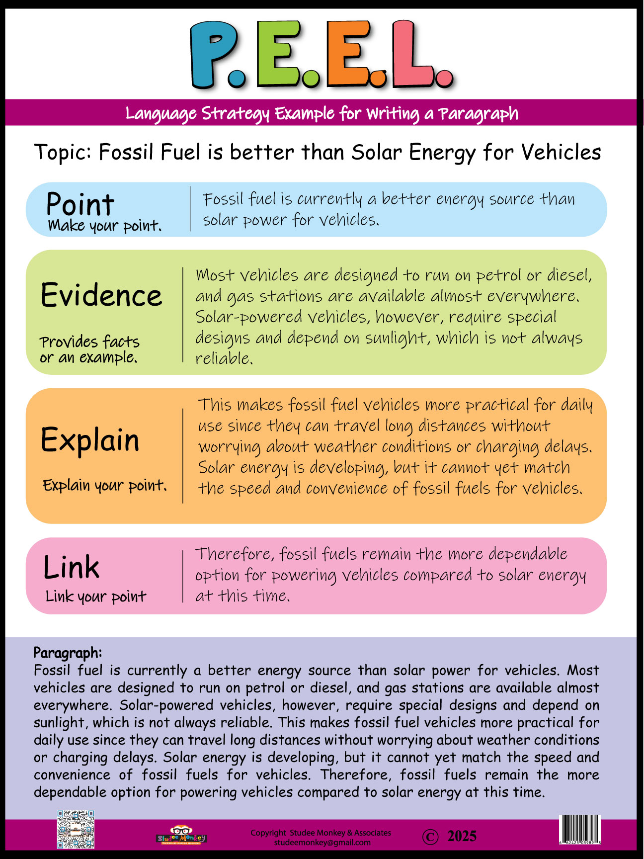 P.E.E.L. Writing Strategy Classroom Chart – Fossil Fuel vs Solar Energy Example